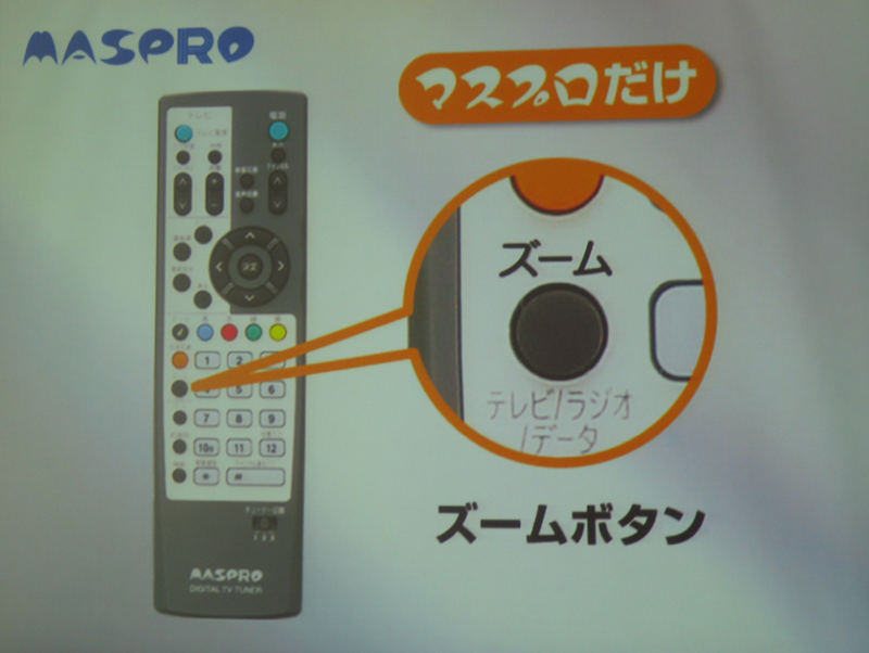 HOME > ニュース > AV&ホームシアターニュース [CEATEC2005:マスプロ] 1億台のアナログテレビ市場にフィットさせる自社製デジタルチューナーを開発 2005年10月05日 前の写真へ 次の写真へ リモコンにある「ズームボタン」で4対3放送をズームアップできる「フル画面表示機能」 前の写真へ 次の写真へ この写真の記事へ 関連リンク 会場からの速報レポート一覧 Phile-web CEATEC JAPAN 2005 特設ペ-ジ CEATEC JAPAN 2005 オフィシャルサイト