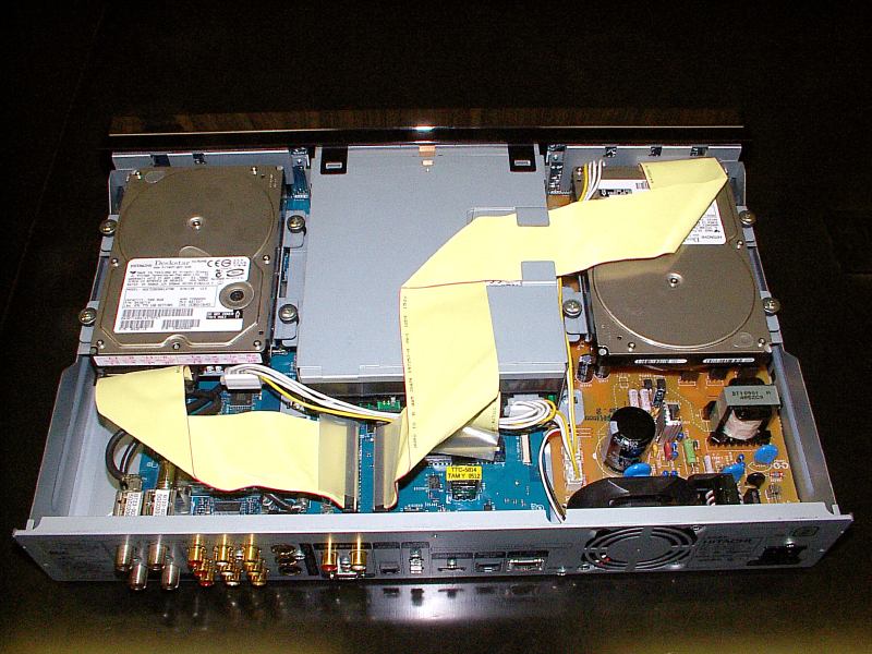 本機の内部はPCのようにシンプルな構成で、DVDドライブの両脇に2台のHDDが配置され、その下に電原基板と、青緑色のメイン基板が置かれている。HDDはシリアルATA接続で、RAID構成ではないが→