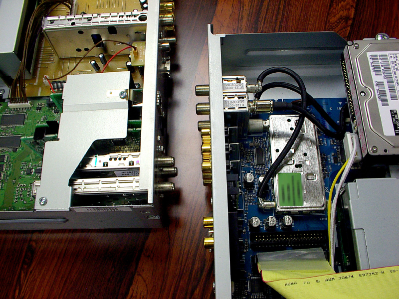 前機(左)では、デジタルとアナログの各チューナーユニットを基板上に外付けしていたが、本機(右)では複合チューナーユニット2個をオンボードにして、小型化とスリム化、クオリティの向上を図っている