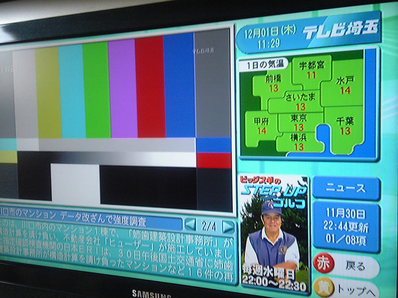 HOME > ニュース > AV&ホームシアターニュース 地デジ2周年〜今日から東京タワーがフルパワー&東北で放送開始 2005年12月01日 前の写真へ 次の写真へ 地デジ放送開始直前のテレビ埼玉の映像(写真提供:放送アナリスト 佐藤和俊) 前の写真へ 次の写真へ この写真の記事へ 関連リンク 社団法人 地上デジタル放送推進委員会(D-PA)
