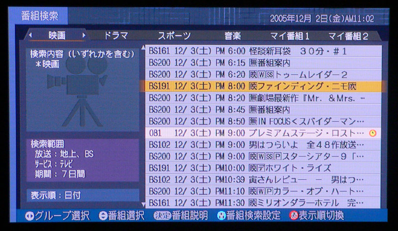EPGの検索は「べんり」→「番組ガイド」→「番組検索」から操作する。表示はジャンル別に絞り込みを行う方式で、条件は細かくカスタマイズできる
