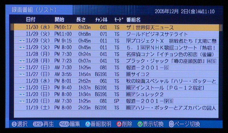 録画した番組が大量にある場合には、緑ボタンでリスト表示に切り換えるとタイトルによる一覧表示で探すことができる