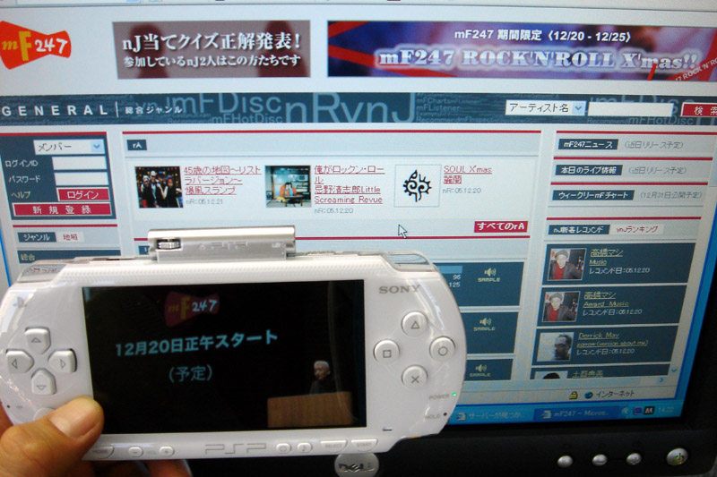 HOME > ニュース > AV&ホームシアターニュース <佐藤和俊の緊急レポート>無料音楽配信サイト「music forcast 247」が本日オープン 2005年12月20日 次の写真へ 19日の会見でお話する丸山代表をPSPで観る。祝サイトオーブン! 次の写真へ この写真の記事へ 関連リンク music forcast 247 吉田直矢 ホームページ
