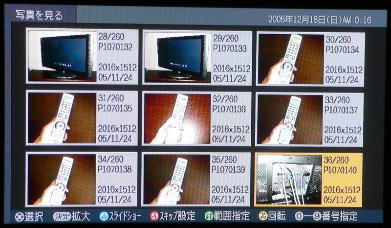 SDメモリーカードに保存してあるデジカメの画像はサムネイルとして一覧で表示でき、選択すると画面一杯に表示できる。黄色ボタンで90度回転して表示することも可能だ。