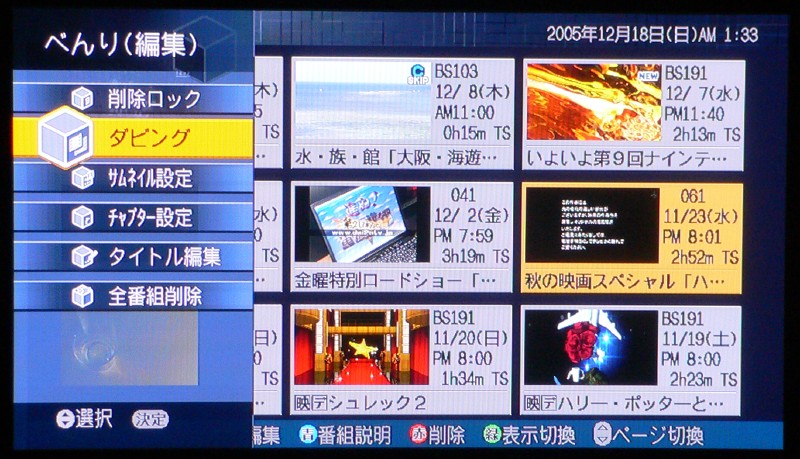内蔵ハードディスクに録画した番組を外部の機器にダビングするには、「ディスクナビゲーション」で「べんり」ボタンを押して「ダビング」を選ぶ。