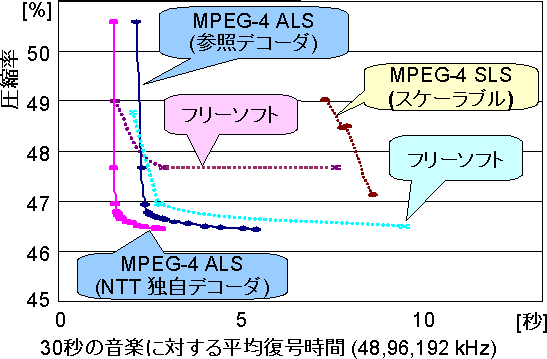 HOME > ニュース > AV&ホームシアターニュース NTT主導で開発したロスレスオーディオ技術が「MPEG-4 ALS」として承認 2005年12月28日 競合技術との圧縮性能比較 この写真の記事へ 関連リンク NTT発表のニュースリリース