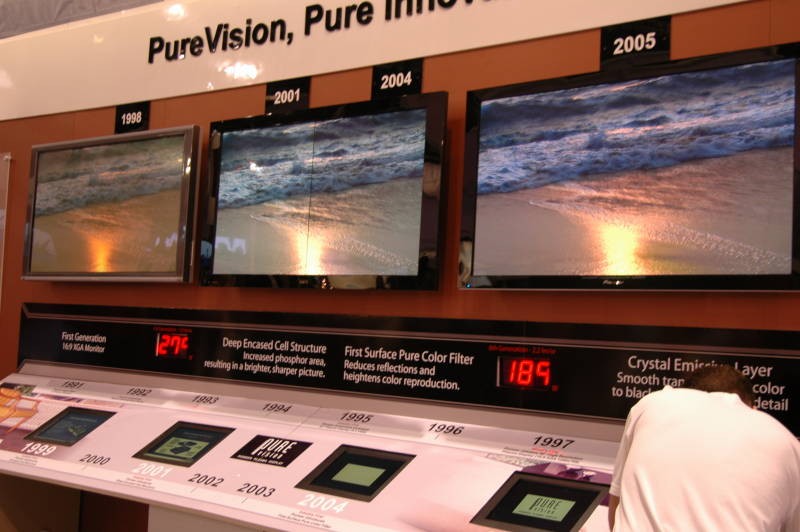 パイオニアは自社パネルの変遷を展示してPDPの新旧比較を行った