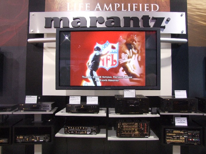 マランツのブース正面には、主力製品であるAVアンプ、DVDプレーヤーとプラズマテレビが展示された。AVアンプ、DVDプレーヤーともブラックモデルが主流