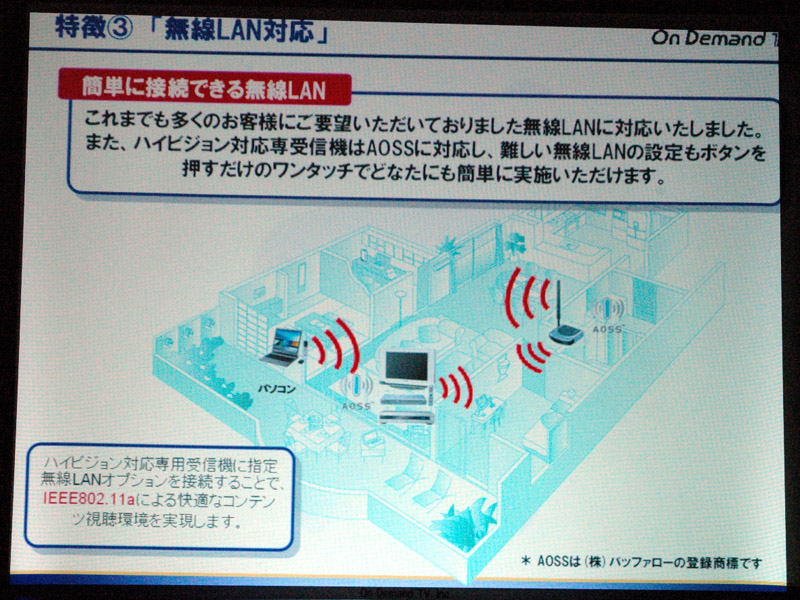 HOME > ニュース > AV&ホームシアターニュース オンデマンドTV、6月よりハイビジョンコンテンツの配信を開始 − 年内500本に 2006年03月02日 前の写真へ 次の写真へ 無線LAN接続の概要 前の写真へ 次の写真へ この写真の記事へ 関連リンク 本件のニュースリリース オンデマンドTV 開始時のPhile-webニュース