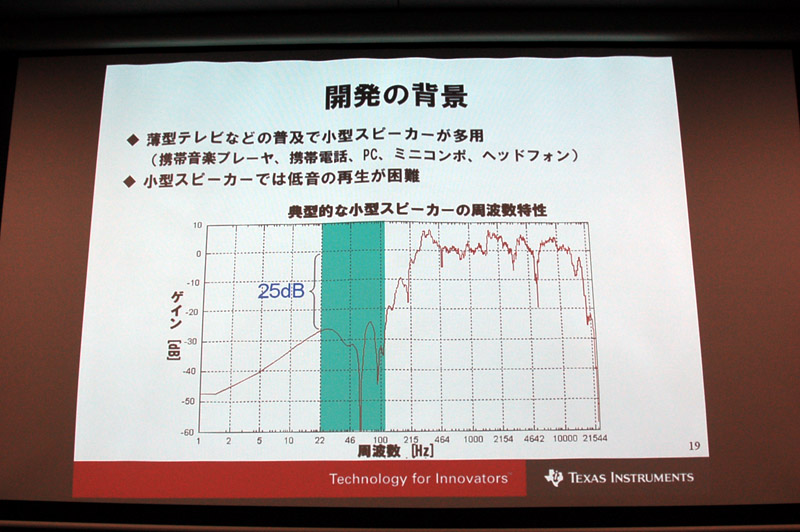 HOME > ニュース > AV&ホームシアターニュース TI、圧縮音声高音質化技術やバーチャルサラウンド技術など発表 2006年03月09日 前の写真へ 次の写真へ 小型スピーカーは低域の再生が苦手 前の写真へ 次の写真へ この写真の記事へ 関連リンク 本件のニュースリリース 日本テキサスインスツルメンツ