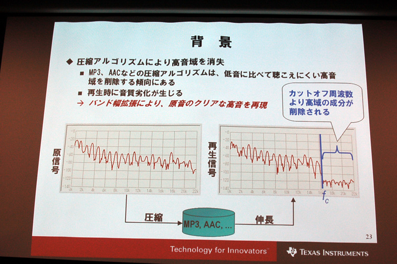 HOME > ニュース > AV&ホームシアターニュース TI、圧縮音声高音質化技術やバーチャルサラウンド技術など発表 2006年03月09日 前の写真へ 次の写真へ 圧縮音声は高域がカットされている 前の写真へ 次の写真へ この写真の記事へ 関連リンク 本件のニュースリリース 日本テキサスインスツルメンツ