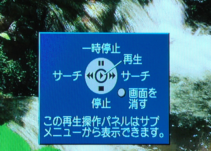 再生を選ぶと、DIGAの再生ナビが表示され、タイトルを選んで再生できる。再生中は、十字ボタンが図のように再生系ボタンとして使えるしくみだ