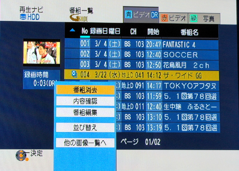 再生ナビは従来のDIGAと同じ。VIERAリモコンのサブメニューボタンと十字ボタンで、消去や編集などのコマンドも選べる。このあたりもDIGAの作法と同じだ