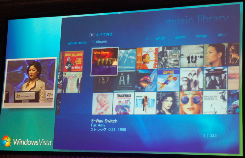 HOME > ニュース > AV&ホームシアターニュース ビル・ゲイツ氏が語る「Windows Vista」の可能性 − MCE次期バージョンのデモも 2006年04月21日 前の写真へ 次の写真へ 音楽再生時にアルバムを一覧表示して好みの曲を探すこともできる 前の写真へ 次の写真へ この写真の記事へ 関連リンク マイクロソフト Windows Vista 詳細ページ