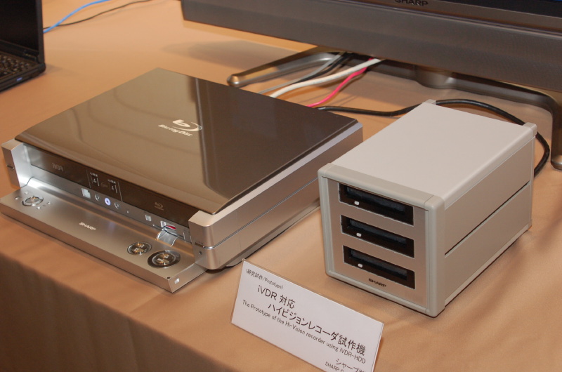 シャープのレコーダー試作機。本体にiVDRスロットを装備するほか、外付けのリーダーで複数のiVDRを接続できる