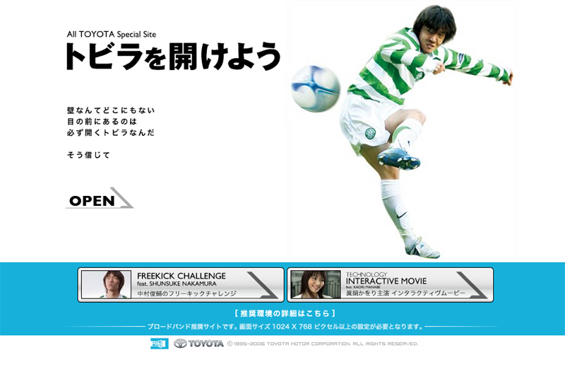 HOME > ニュース > AV&ホームシアターニュース 中村俊輔選手出演! − トヨタ「トビラを開けよう」キャンペーン公式Webサイトが絶賛公開中 2006年05月10日 次の写真へ 次の写真へ この写真の記事へ 関連リンク 「トビラを開けよう」キャンペーンサイト トヨタ自動車
