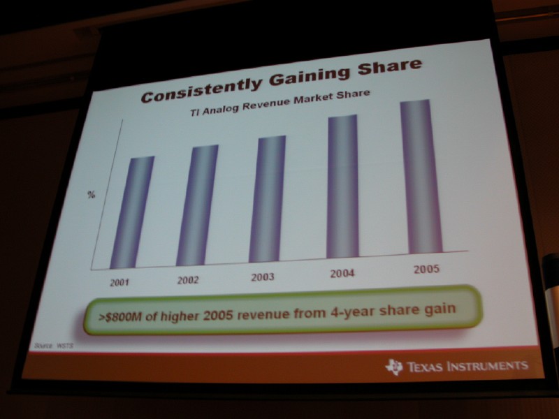 HOME > ニュース > AV&ホームシアターニュース 成長のカギは顧客中心の視点 − TIがアナログIC事業戦略説明会を開催 2006年05月18日 前の写真へ 次の写真へ TIは2005年までに大きな成長を遂げた 前の写真へ 次の写真へ この写真の記事へ 関連リンク 日本テキサス・インスツルメンツ