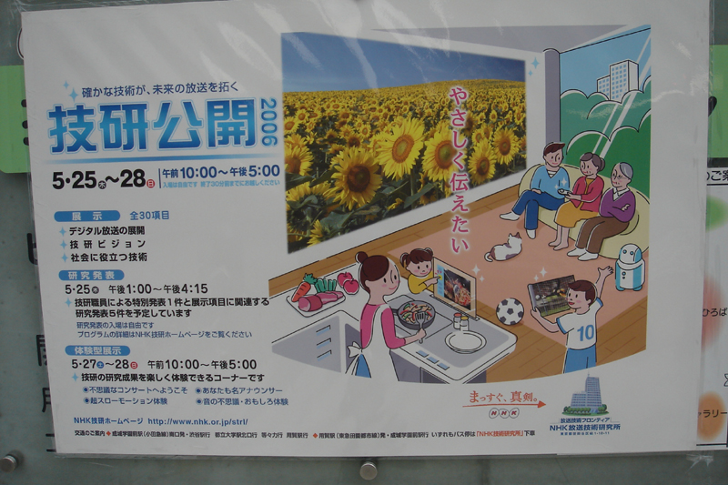 HOME > ニュース > AV&ホームシアターニュース 恒例のNHK技研公開、本日より。サーバー放送のデモなど展示 2006年05月25日 次の写真へ NHK技研公開の看板 次の写真へ この写真の記事へ 関連リンク NHK技研公開 佐藤和俊のデジタルTVカウントダウン