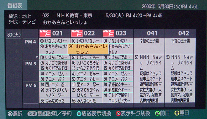 EPGは、選択された番組が拡大表示される。デジタルのサイマル放送チャンネルを別々に表示することも可能になり、NHK教育などの番組が見やすくなった