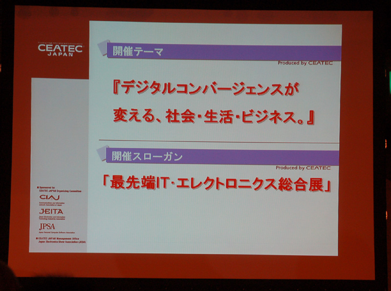HOME > ニュース > AV&ホームシアターニュース 最先端IT・エレクトロニクス総合展 − CEATEC JAPAN 2006開催説明会を開催 2006年07月20日 前の写真へ 次の写真へ 今年の開催テーマは「デジタルコンバージェンスが変える、社会・生活・ビジネス」 前の写真へ 次の写真へ この写真の記事へ 関連リンク CEATEC JAPAN公式ページ