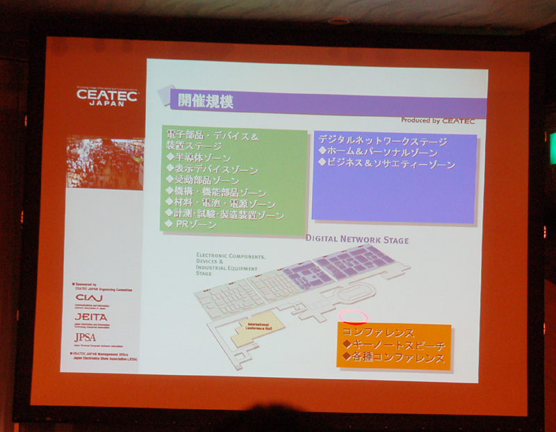 HOME > ニュース > AV&ホームシアターニュース 最先端IT・エレクトロニクス総合展 − CEATEC JAPAN 2006開催説明会を開催 2006年07月20日 前の写真へ 次の写真へ イベントの開催規模も拡大をつづける 前の写真へ 次の写真へ この写真の記事へ 関連リンク CEATEC JAPAN公式ページ