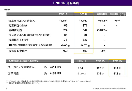 ソニー、2006年第1四半期の連結業績を発表 − BRAVIA、α、ケータイが好調