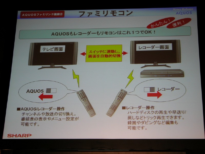 ファミリモコンにはテレビ/レコーダーの切り替えスイッチを備え、それぞれを素早く使い分けられる
