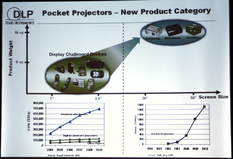 HOME > ニュース > AV&ホームシアターニュース LED光源でカラーホイールが不要に − 日本TIが今後のDLP戦略を語る 2006年08月08日 前の写真へ 次の写真へ ポケットプロジェクターの今後の推移 前の写真へ 次の写真へ この写真の記事へ 関連リンク DLPオフィシャルサイト 日本TI Phile-webニュース【日本TI、コントラストを20%高めた新DLP「.65WXGA DarkChip3」を発表 − 搭載PJも近日発表】