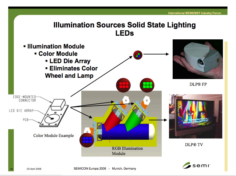 HOME > ニュース > AV&ホームシアターニュース LED光源でカラーホイールが不要に − 日本TIが今後のDLP戦略を語る 2006年08月08日 前の写真へ LED光源のDLP TV、フロントプロジェクターの概念図 前の写真へ この写真の記事へ 関連リンク DLPオフィシャルサイト 日本TI Phile-webニュース【日本TI、コントラストを20%高めた新DLP「.65WXGA DarkChip3」を発表 − 搭載PJも近日発表】