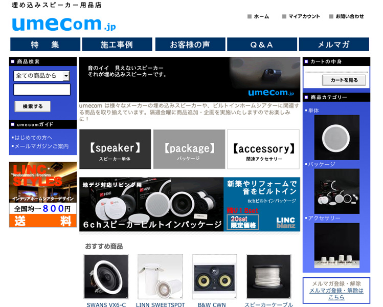 HOME > ニュース > AV&ホームシアターニュース 日本初の埋込みスピーカー用品専門店「umecom.jp」が本格始動 2006年08月25日 umecom.jp 施工事例TOPペー この写真の記事へ