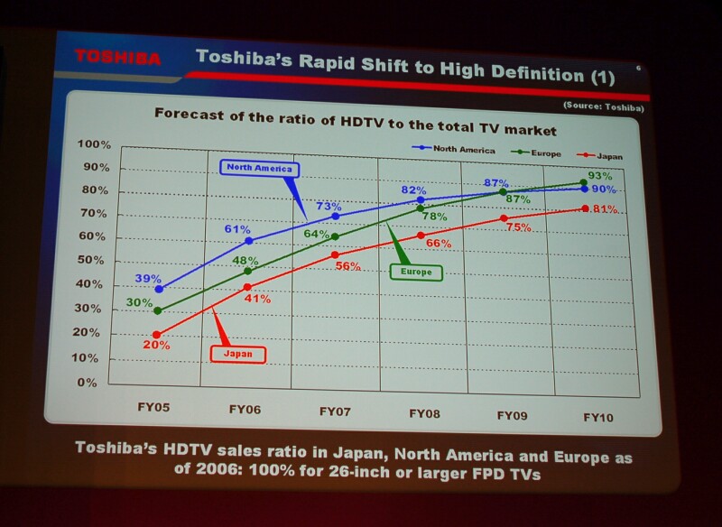 欧州をはじめ、日本、北米でもハイビジョンテレビの需要が急速に高まっていることをグラフより紹介した