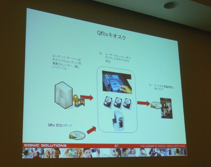 HOME > ニュース > AV&ホームシアターニュース ソニックが本年度事業戦略説明会を開催 − ハリウッドと連携したビジネス強化を宣言 2006年09月12日 前の写真へ 次の写真へ キオスク等販売店におけるQFlixサービスの展開イメージ 前の写真へ 次の写真へ この写真の記事へ 関連リンク ソニック・ソルーションズ