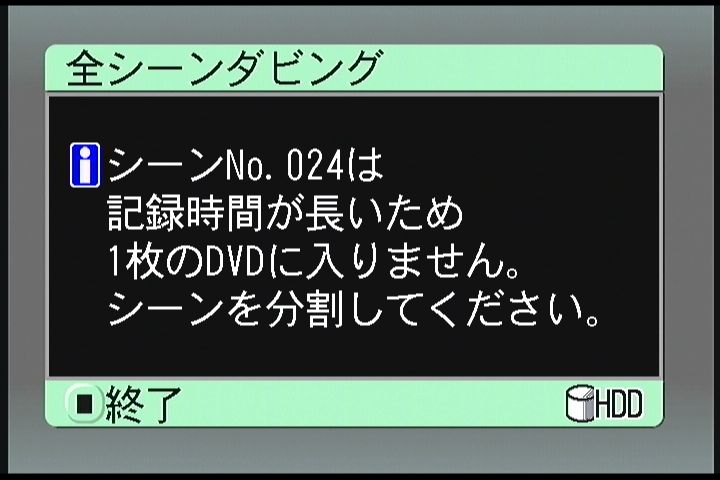 HOME > ニュース > AV&ホームシアターニュース ハイブリッドカメラ「DZ-HS303」を増田和夫が試す<3> ハンドリングレポート 2006年09月28日 前の写真へ 次の写真へ 1つのシーンが8cmDVDの容量1.4GBをオーバーしてしまう時のメッセージ。この場合はダビングを中止し、シーンを分割後に再度ダビングする 前の写真へ 次の写真へ この写真の記事へ 関連リンク Phile-webニュース【日立、世界初のHDD/DVDハイブリッドカメラ「DZ-HS303」を発売】 Phile-webニュース【「カメラ革命の第一歩」 ― ハイブリッドカム“Wooo”発表会レポート】 Phile-web「Wooo WoRLD」