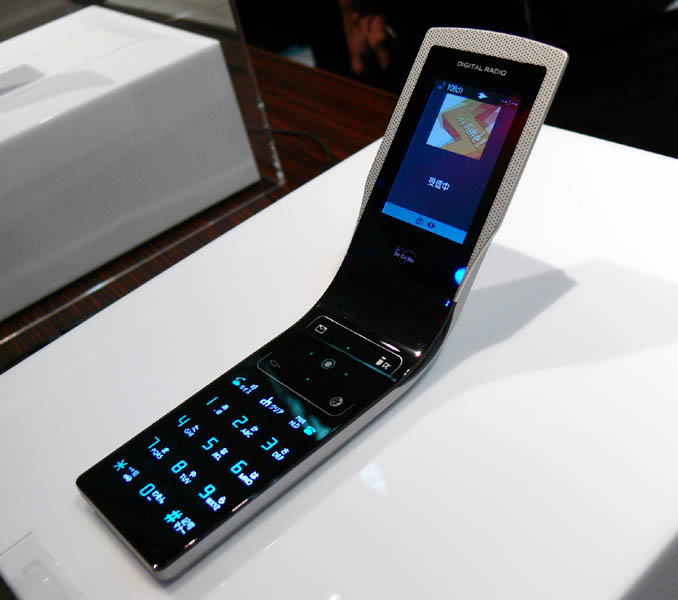 ドコモのデジタルラジオ対応端末。試作機のため折り畳むことはできなかった