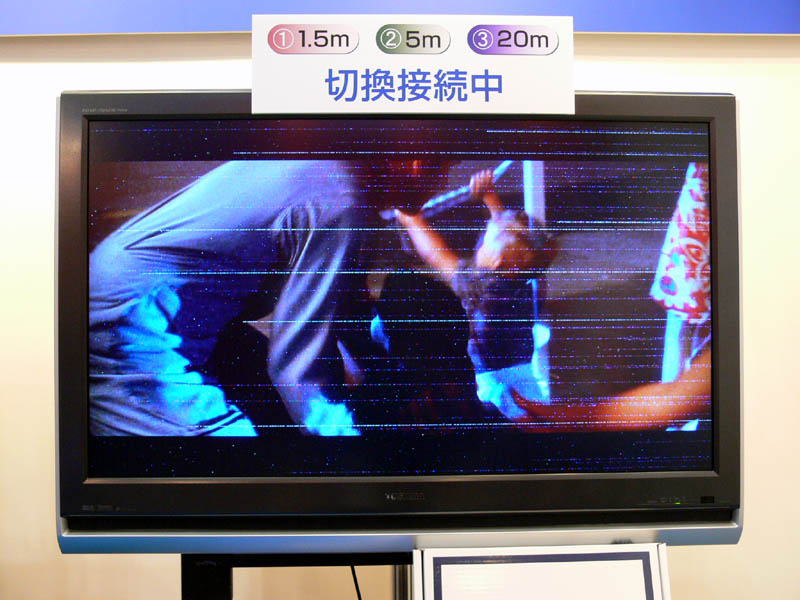HOME > ニュース > AV&ホームシアターニュース <CEATEC2006:エイム電子>30mの長尺を実現したイコライザー付きHDMIケーブルを展示 2006年10月05日 前の写真へ イコライザーのない20mのHDMIケーブルを使用。ノイズが多く発生しているのがわかる 前の写真へ この写真の記事へ 関連リンク Phile-web CEATEC関連ニュース一覧 CEATEC公式サイト
