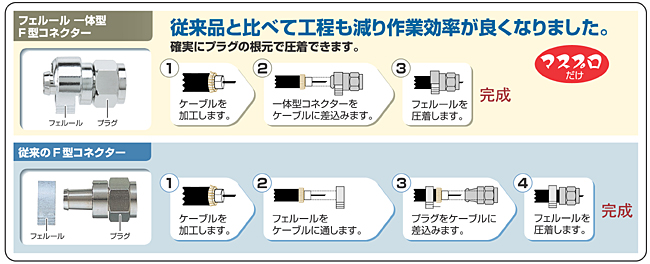 HOME > ニュース > AV&ホームシアターニュース マスプロ電工、RoHS指令に対応したフェルール一体型F型コネクターを発売 2006年10月11日 前の写真へ 作業効率も向上する 前の写真へ この写真の記事へ 関連リンク 本製品のニュースリリース