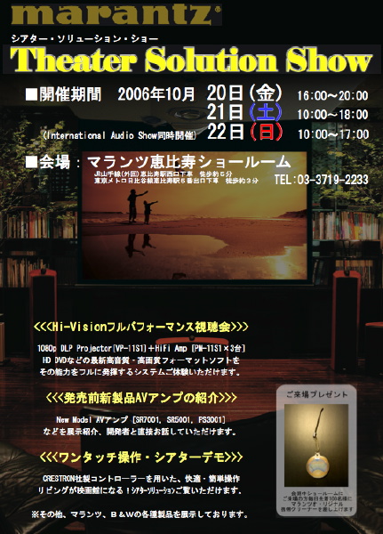 HOME > ニュース > AV&ホームシアターニュース あすからマランツが体験イベント「Theater Solution Show in 恵比寿」を開催! 2006年10月19日 次の写真へ イベントのリーフレット 次の写真へ この写真の記事へ 関連リンク イベントの詳細 マランツ