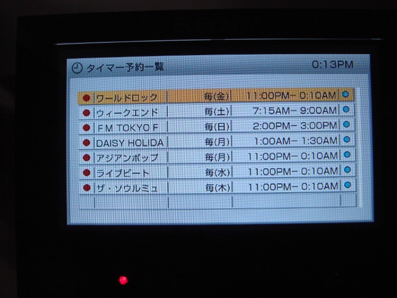 すでにFMの設定は済ませてある。リモコンのタイマーボタンを押すと予約一覧が表示される。オプションボタンで予約設定画面へ