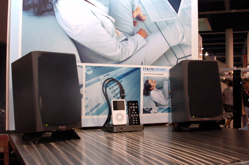 同社初のマルチメディアスピーカー「MC15」。真ん中のiPodと比べると、その大きさがわかる