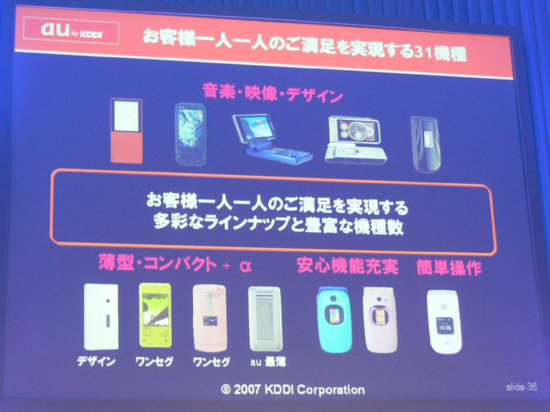 HOME > ニュース > AV&ホームシアターニュース 「高音質・高デザイン性・高画質」 ― あらゆる要素で本物を目指すau新モデルが発表 2007年01月16日 前の写真へ 次の写真へ 今回発表されたラインナップ 前の写真へ 次の写真へ この写真の記事へ