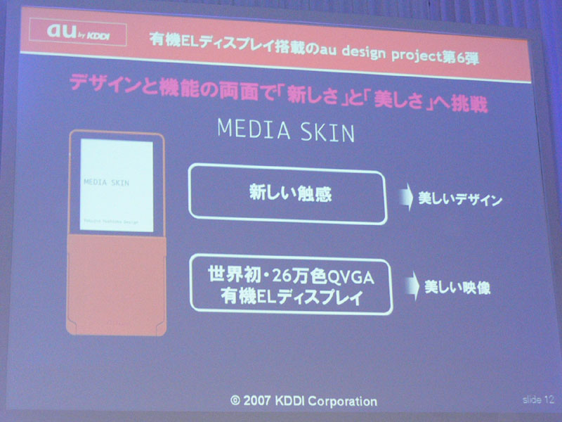 HOME > ニュース > AV&ホームシアターニュース 「高音質・高デザイン性・高画質」 ― あらゆる要素で本物を目指すau新モデルが発表 2007年01月16日 前の写真へ 次の写真へ 「MEDIA SKIN」のコンセプト 前の写真へ 次の写真へ この写真の記事へ