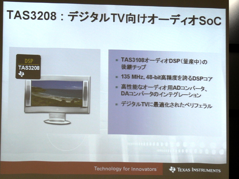 HOME > ニュース > AV&ホームシアターニュース 日本TI、北米/欧州向けの1080p対応HDTV用プロセッサーなど発表 2007年01月25日 前の写真へ 次の写真へ オーディオプロセッサー「TAS3208」の概要 前の写真へ 次の写真へ この写真の記事へ 関連リンク TVP9010のニュースリリース 日本テキサス・インスツルメンツ
