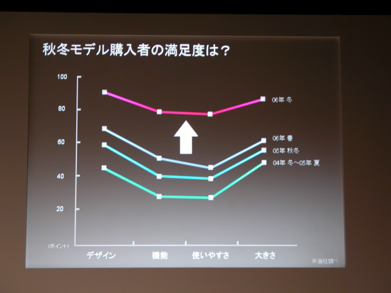 HOME > ニュース > AV&ホームシアターニュース 2007年春モデルは「薄さ・ワンセグ・ファッション」で勝負 − ソフトバンク・孫社長記者会見 2007年01月25日 前の写真へ 次の写真へ 2006年秋冬モデルは地デジ対応モデル、薄型モデルを中心にユーザー満足度が高まったという 前の写真へ 次の写真へ この写真の記事へ 関連リンク ソフトバンクモバイル
