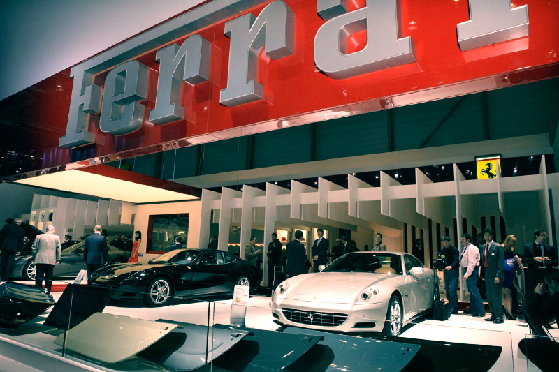 ジュネーブショーにおけるフェラーリのブース。「The Media System」を搭載した612スカリエッティは2台展示した他、カットモデルや実際に操作できるキオスクを数多く用意する力の入れようだ