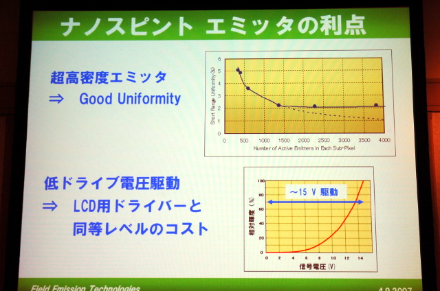 ナノスピントエミッタ方式にしたことで、高い均一性とドライバーの低コスト化が図れる
