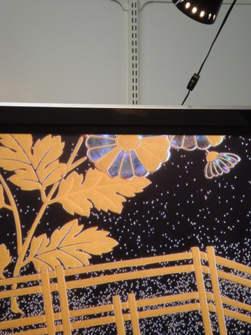 ファインブラックフィルターの効果を確かめるデモ。これほどの近距離から光をあてても外光を反射しない画面は見事。ツヤぴかのパネルを搭載していると、室内光が映り込んで見苦しいが、本機ではその心配も不要だ