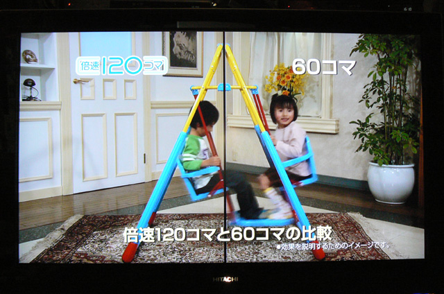 倍速120コマを説明する店頭デモ用の映像。実際に動画再生性能の高さが実感できた。通常は秒間60コマのテレビ放送を、コマとコマ間に黒い映像を入れることで動画再生時ブレを軽減している