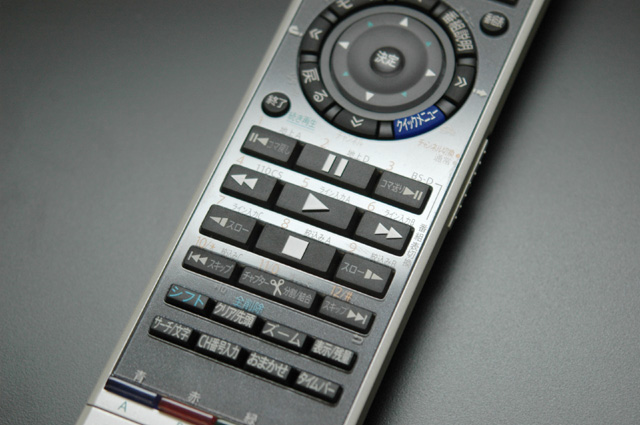 本機のリモコン。「一時停止・再生・停止」などの十字方向のボタンは記号に凹凸を設けている