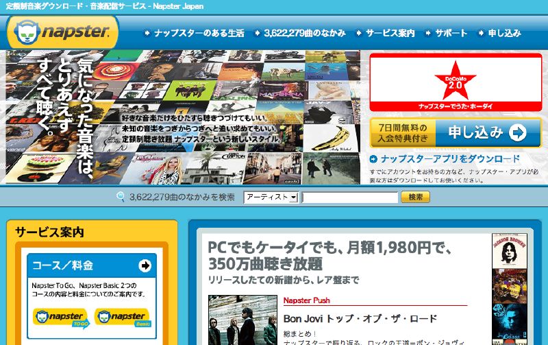HOME > ニュース > AV&ホームシアターニュース ナップスター公式サイトがリニューアル − ウェブで楽曲検索が可能に 2007年07月02日 Napster公式サイトのトップページ この写真の記事へ 関連リンク Napster公式サイト