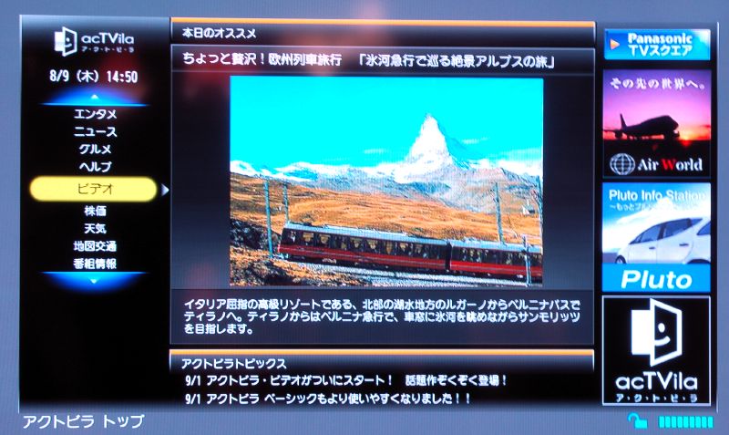 アクトビラのトップ画面。左のメニューで見たい動画のジャンルを選択する